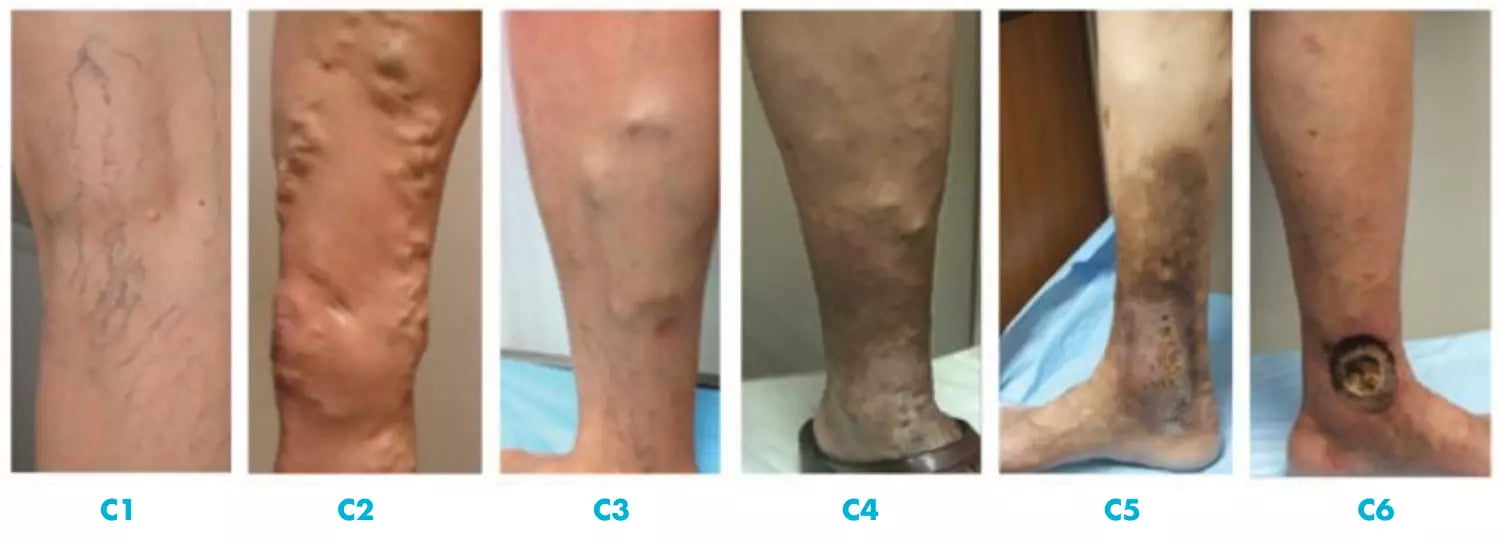 c 3= svullnad i benet orsakat av försvagade klaffar i vensystemet. Ytliga åderbråck behöver inte vara framträdande.